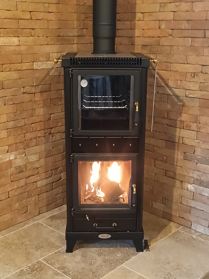 Avec son revêtement en carreaux de faïence noirs (disponibles en de nombreuses autres couleurs sur demande), ce poêle devient une véritable pièce maîtresse de votre décoration. Sa structure en fonte massive lui confère robustesse et une excellente inertie thermique. Les finitions, disponibles en laiton ou en inox, apportent une touche de raffinement supplémentaire, s’adaptant à tous les styles d’intérieur, du plus classique au plus contemporain. Le four intégré ajoute non seulement une dimension pratique pour la cuisson, mais accentue également l’aspect traditionnel et convivial de l’appareil.